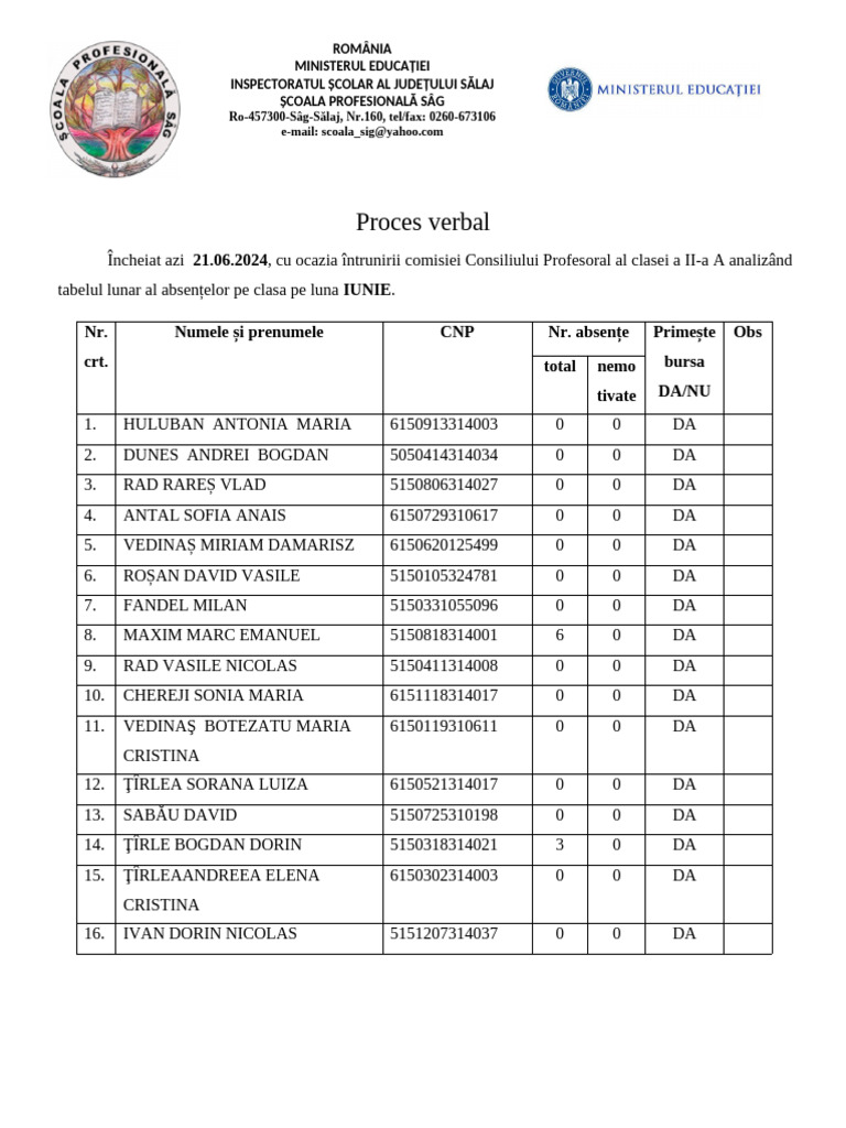 Consiliul de profesori ai clasei a II-a A, analizand tabelul cu absente pe luna IUNIE, a hotărât să