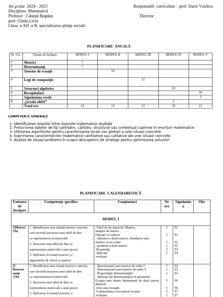 An şcolar: 2024 - 2025 Responsabil curriculum : prof.