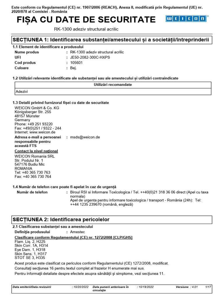 Data emiterii/Data revizuirii : 10/20/2022 Data punerii anterioare în : 10/19/2022 Versiune : 4.01 1/17