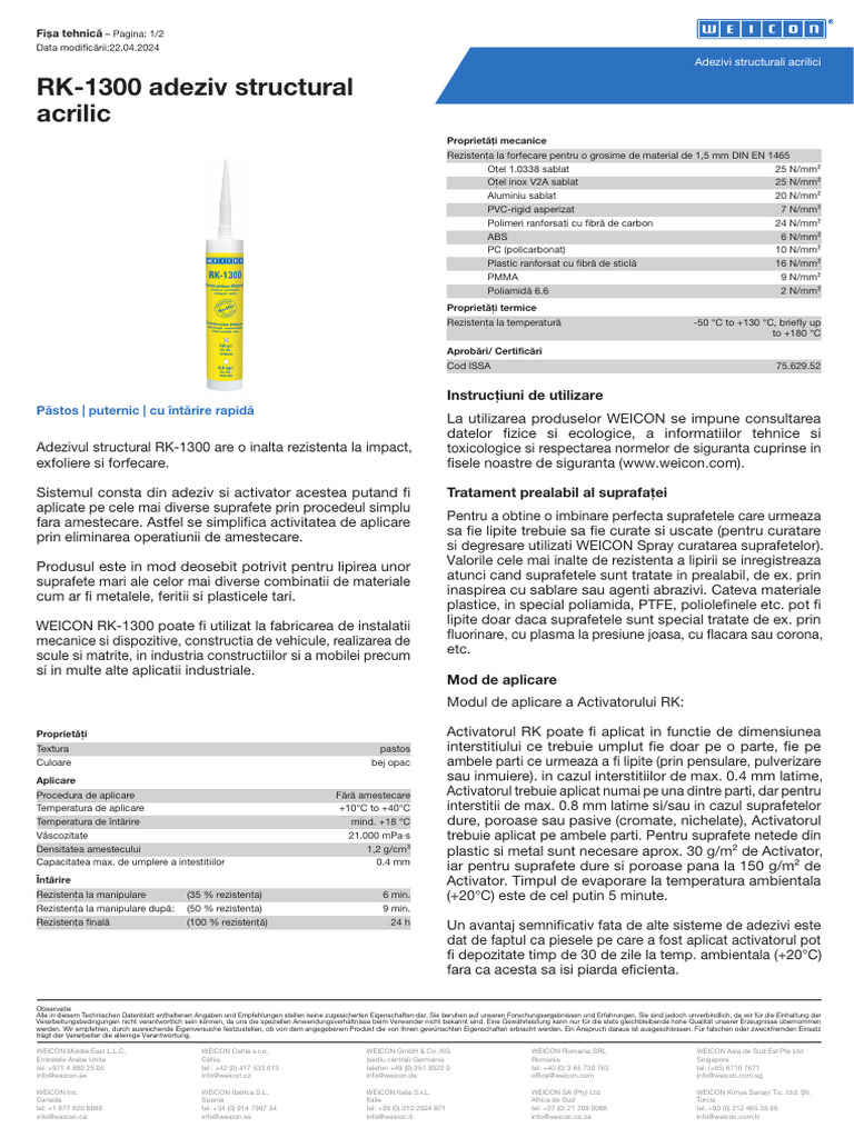 Adezivul structural RK-1300 are o inalta rezistenta la impact, toxicologice si respectarea normelor de siguranta cuprinse in