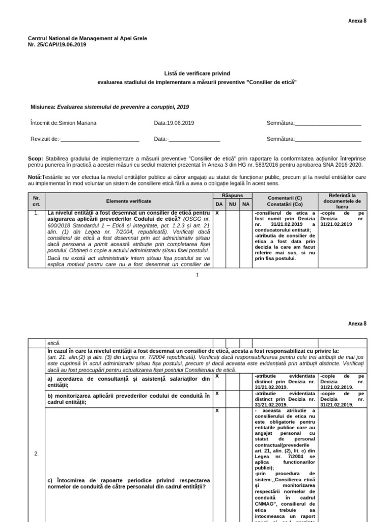 Scop: Stabilirea gradului de implementare a măsurii preventive ”Consilier de etică” prin raportare la conformitatea acțiunilor întreprinse