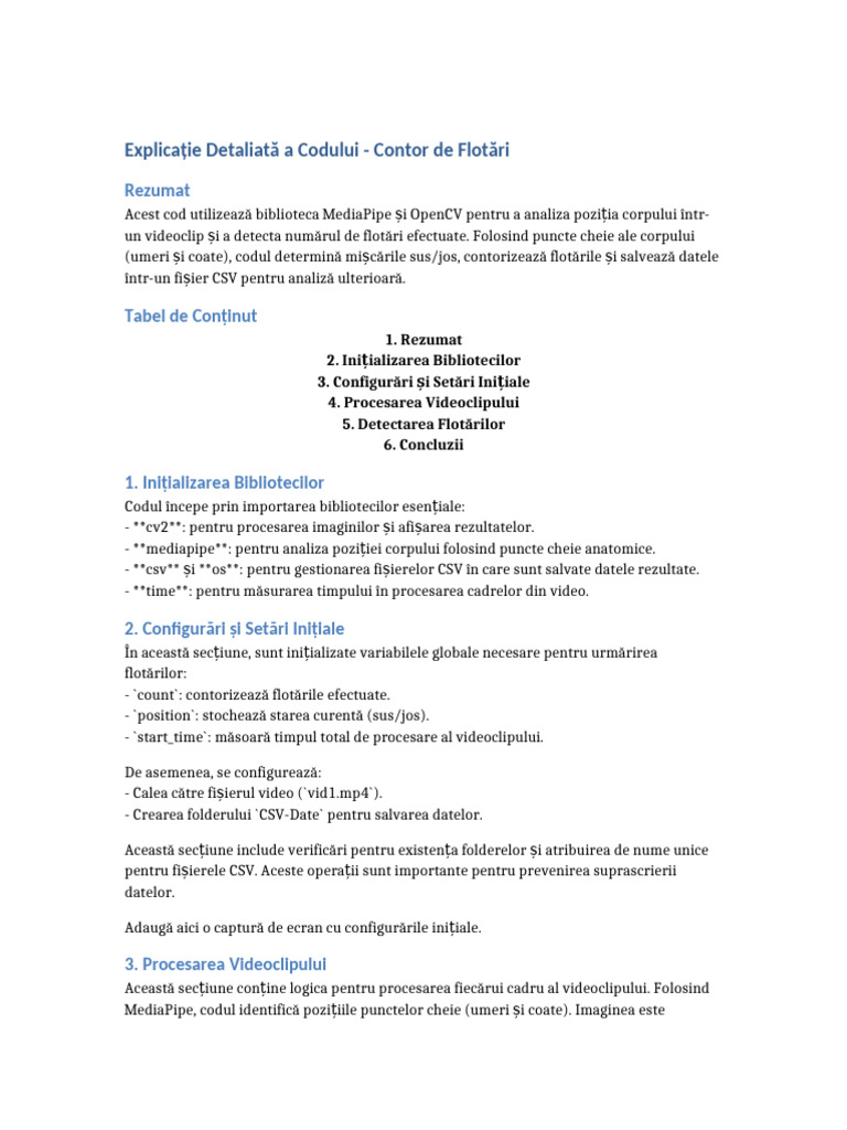 (umeri și coate), codul determină mișcările sus/jos, contorizează flotările și salvează datele