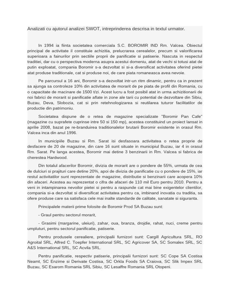Analizati cu ajutorul analizei SWOT, intreprinderea descrisa in textul urmator.