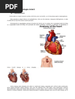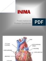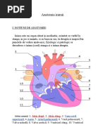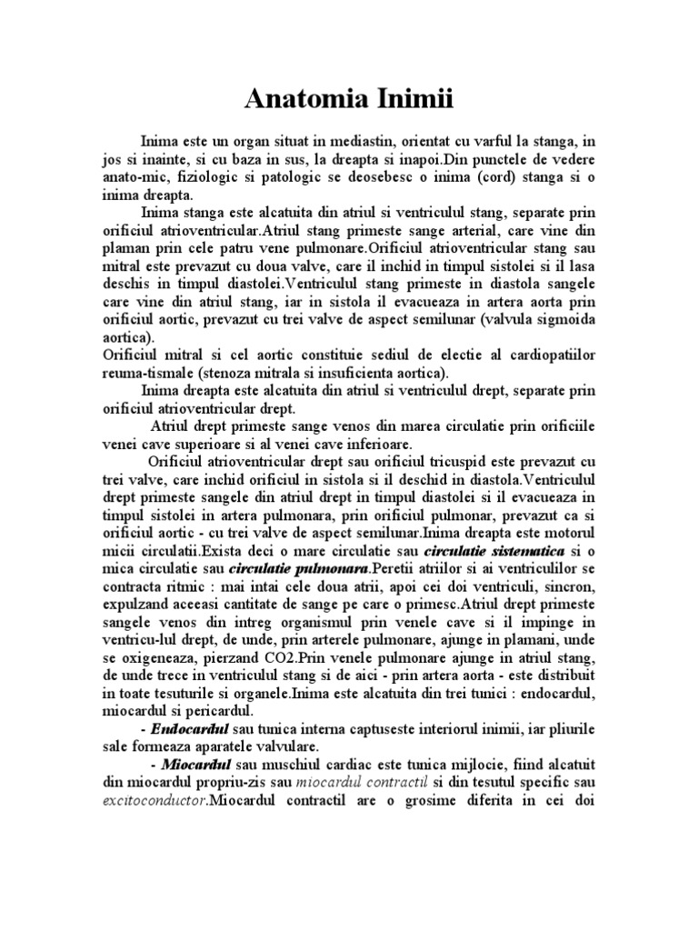 Inima este un organ situat in mediastin, orientat cu varful la stanga, in jos si inainte, si cu baza in sus, la dreapta si [Link] punctele de vedere anato-mic, fiziologic si patologic se deosebesc o inima (cord) stanga si o inima dreapta. Inima stanga este alcatuita din atriul si ventriculul stang, separate prin orificiul [Link] stang primeste sange arterial, care vine din plaman prin cele patru vene [Link] atrioventricular stang sau mitral este prevazut cu doua valve, care il inchid in timpul sistolei si il lasa deschis in timpul [Link] stang primeste in diastola sangele care vine din atriul stang, iar in sistola il evacueaza in artera aorta prin orificiul aortic, prevazut cu trei valve de aspect semilunar (valvula sigmoida aortica). Orificiul mitral si cel aortic constituie sediul de electie al cardiopatiilor reuma-tismale (stenoza mitrala si insuficienta aortica). Inima dreapta este alcatuita din atriul si ventriculul drept, separate prin orificiul atrioventricular drept. Atriul drept primeste sange venos din marea circulatie prin orificiile venei cave superioare si al venei cave inferioare. Orificiul atrioventricular drept sau orificiul tricuspid este prevazut cu trei valve, care inchid orificiul in sistola si il deschid in [Link] drept primeste sangele din atriul drept in timpul diastolei si il evacueaza in timpul sistolei in artera pulmonara, prin orificiul pulmonar, prevazut ca si orificiul aortic - cu trei valve de aspect [Link] dreapta este motorul micii [Link] deci o mare circulatie sau circulatie sistematica si o mica circulatie sau circulatie [Link] atriilor si ai ventriculilor se contracta ritmic : mai intai cele doua atrii, apoi cei doi ventriculi, sincron, expulzand aceeasi cantitate de sange pe care o [Link] drept primeste sangele venos din intreg organismul prin venele cave si il impinge in ventricu-lul drept, de unde, prin arterele pulmonare, ajunge in plamani, unde se oxigeneaza, pierzand [Link] venele pulmonare ajunge in atriul stang, de unde trece in ventriculul stang si de aici - prin artera aorta - este distribuit in toate tesuturile si [Link] este alcatuita din trei tunici : endocardul, miocardul si pericardul. - Endocardul sau tunica interna captuseste interiorul inimii, iar pliurile sale formeaza aparatele valvulare. - Miocardul sau muschiul cardiac este tunica mijlocie, fiind alcatuit din miocardul propriu-zis sau miocardul contractil si din tesutul specific sau [Link] contractil are o grosime diferita in cei doi