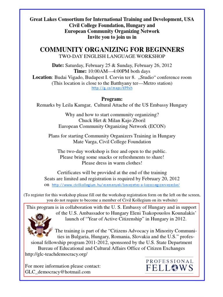 Program: Remarks by Leila Kamgar, Cultural Attache of the US Embassy Hungary Why and how to start community organizing? Chuck Hirt & Milan Kajo Zboril European Community Organizing Network (ECON) Plans for starting Community Organizers Training in Hungary Mate Varga, Civil College Foundation The two-day workshop is free and open to the public. Please bring some snacks or refreshments to share! Please dress in warm clothes! Certificates will be provided at the end of the training Seats are limited and registration is required by February 20, 2012 on http://www.civilkollegium.hu/esemenyek/bevezetes-a-kozossegszervezesbe/