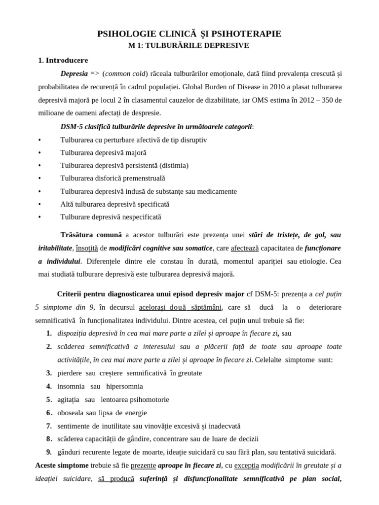 1. Dispoziție depresivă în cea mai mare parte a zilei, aproape în fiecare zi, descrisă de pacient