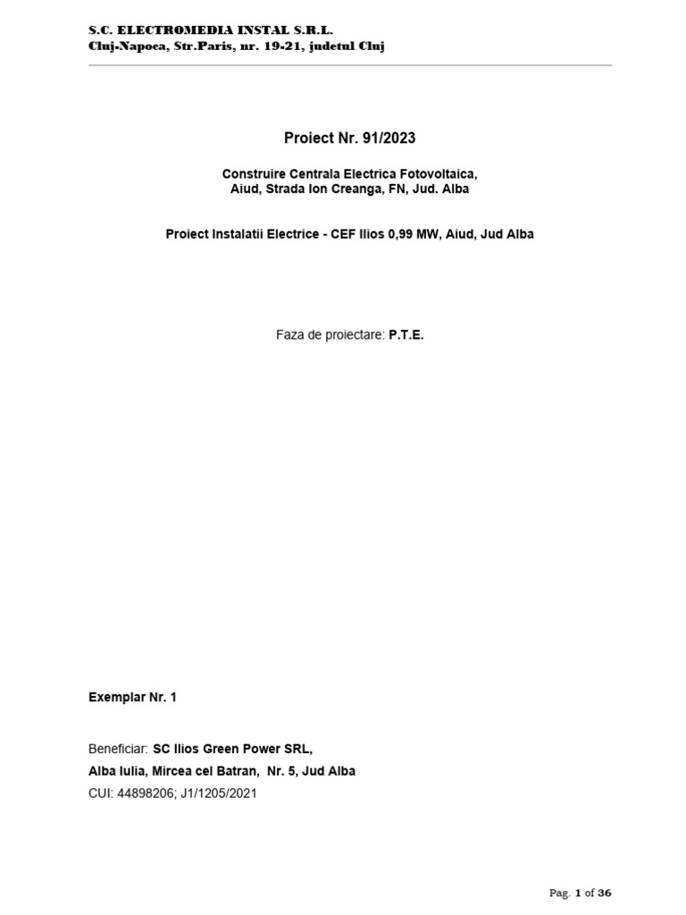 Proiect Instalatii Electrice - CEF Ilios 0,99 MW, Aiud, Jud Alba