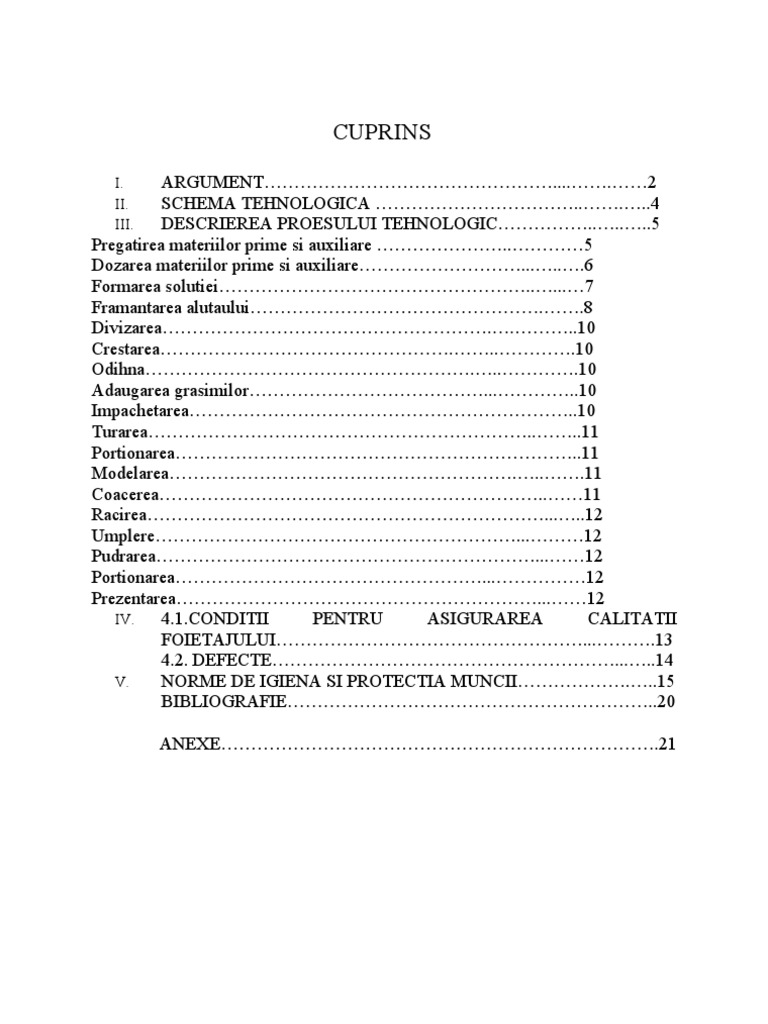 ARGUMENT.....2 SCHEMA TEHNOLOGICA .....4 DESCRIEREA PROESULUI TEHNOLOGIC......5 Pregatirea materiilor prime si auxiliare ..5 Dozarea materiilor prime si auxiliare......6 Formarea solutiei.....7 Framantarea alutaului..8 Divizarea....10 Crestarea....10 Odihna....10 Adaugarea grasimilor.....10 Impachetarea..10 Turarea....11 Portionarea..11 Modelarea....11 Coacerea..11 Racirea.....12 Umplere...12 Pudrarea...12 Portionarea...12 Prezentarea...12 IV. [Link] PENTRU ASIGURAREA CALITATII FOIETAJULUI....13 4.2. DEFECTE.....14 V. NORME DE IGIENA SI PROTECTIA MUNCII...15 BIBLIOGRAFIE..20
