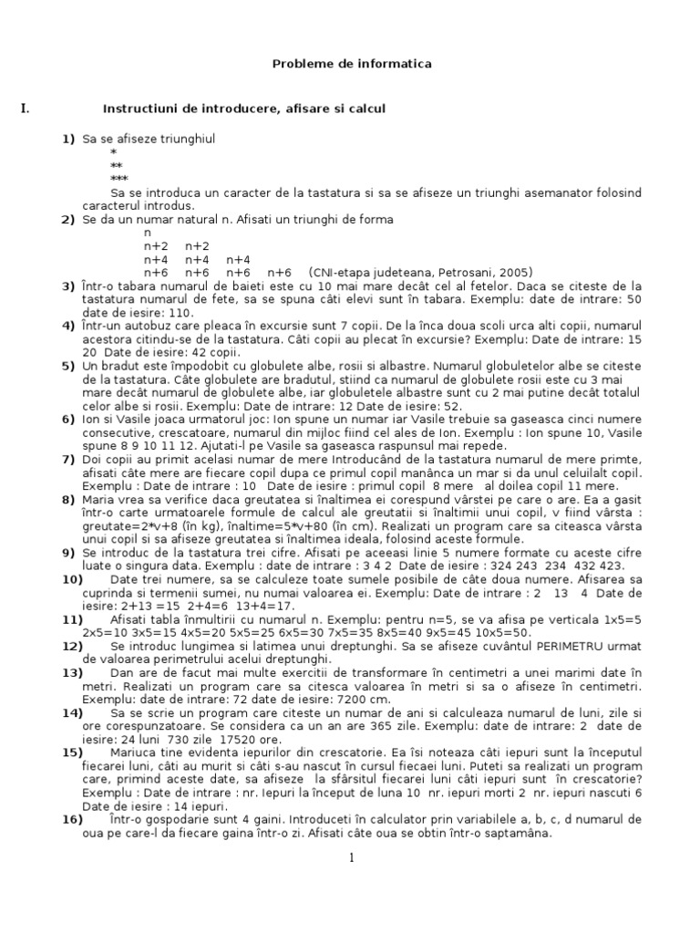 Instructiuni de introducere, afisare si calcul 1) Sa se afiseze triunghiul * ** *** Sa se introduca un caracter de la tastatura si sa se afiseze un triunghi asemanator folosind caracterul introdus. 2) Se da un numar natural n. Afisati un triunghi de forma n n+2 n+2 n+4 n+4 n+4 n+6 n+6 n+6 n+6 (CNI-etapa judeteana, Petrosani, 2005) 3) ntr-o tabara numarul de baieti este cu 10 mai mare dect cel al fetelor. Daca se citeste de la tastatura numarul de fete, sa se spuna cti elevi sunt n tabara. Exemplu: date de intrare: 50 date de iesire: 110. 4) ntr-un autobuz care pleaca n excursie sunt 7 copii. De la nca doua scoli urca alti copii, numarul acestora citindu-se de la tastatura. Cti copii au plecat n excursie? Exemplu: Date de intrare: 15 20 Date de iesire: 42 copii. 5) Un bradut este mpodobit cu globulete albe, rosii si albastre. Numarul globuletelor albe se citeste de la tastatura. Cte globulete are bradutul, stiind ca numarul de globulete rosii este cu 3 mai mare dect numarul de globulete albe, iar globuletele albastre sunt cu 2 mai putine dect totalul celor albe si rosii. Exemplu: Date de intrare: 12 Date de iesire: 52. 6) Ion si Vasile joaca urmatorul joc: Ion spune un numar iar Vasile trebuie sa gaseasca cinci numere consecutive, crescatoare, numarul din mijloc fiind cel ales de Ion. Exemplu : Ion spune 10, Vasile spune 8 9 10 11 12. Ajutati-l pe Vasile sa gaseasca raspunsul mai repede. 7) Doi copii au primit acelasi numar de mere Introducnd de la tastatura numarul de mere primte, afisati cte mere are fiecare copil dupa ce primul copil mannca un mar si da unul celuilalt copil. Exemplu : Date de intrare : 10 Date de iesire : primul copil 8 mere al doilea copil 11 mere. 8) Maria vrea sa verifice daca greutatea si naltimea ei corespund vrstei pe care o are. Ea a gasit ntr-o carte urmatoarele formule de calcul ale greutatii si naltimii unui copil, v fiind vrsta : greutate=2*v+8 (n kg), naltime=5*v+80 (n cm). Realizati un program care sa citeasca vrsta unui copil si sa afiseze greutatea si naltimea ideala, folosind aceste formule. 9) Se introduc de la tastatura trei cifre. Afisati pe aceeasi linie 5 numere formate cu aceste cifre luate o singura data. Exemplu : date de intrare : 3 4 2 Date de iesire : 324 243 234 432 423. 10) Date trei numere, sa se calculeze toate sumele posibile de cte doua numere. Afisarea sa cuprinda si termenii sumei, nu numai valoarea ei. Exemplu: Date de intrare : 2 13 4 Date de iesire: 2+13 =15 2+4=6 13+4=17. 11) Afisati tabla nmultirii cu numarul n. Exemplu: pentru n=5, se va afisa pe verticala 1x5=5 2x5=10 3x5=15 4x5=20 5x5=25 6x5=30 7x5=35 8x5=40 9x5=45 10x5=50. 12) Se introduc lungimea si latimea unui dreptunghi. Sa se afiseze cuvntul PERIMETRU urmat de valoarea perimetrului acelui dreptunghi. 13) Dan are de facut mai multe exercitii de transformare n centimetri a unei marimi date n metri. Realizati un program care sa citesca valoarea n metri si sa o afiseze n centimetri. Exemplu: date de intrare: 72 date de iesire: 7200 cm. 14) Sa se scrie un program care citeste un numar de ani si calculeaza numarul de luni, zile si ore corespunzatoare. Se considera ca un an are 365 zile. Exemplu: date de intrare: 2 date de iesire: 24 luni 730 zile 17520 ore. 15) Mariuca tine evidenta iepurilor din crescatorie. Ea si noteaza cti iepuri sunt la nceputul fiecarei luni, cti au murit si cti s-au nascut n cursul fiecaei luni. Puteti sa realizati un program care, primind aceste date, sa afiseze la sfrsitul fiecarei luni cti iepuri sunt n crescatorie? Exemplu : Date de intrare : nr. Iepuri la nceput de luna 10 nr. iepuri morti 2 nr. iepuri nascuti 6 Date de iesire : 14 iepuri. 16) ntr-o gospodarie sunt 4 gaini. Introduceti n calculator prin variabilele a, b, c, d numarul de oua pe care-l da fiecare gaina ntr-o zi. Afisati cte oua se obtin ntr-o saptamna.