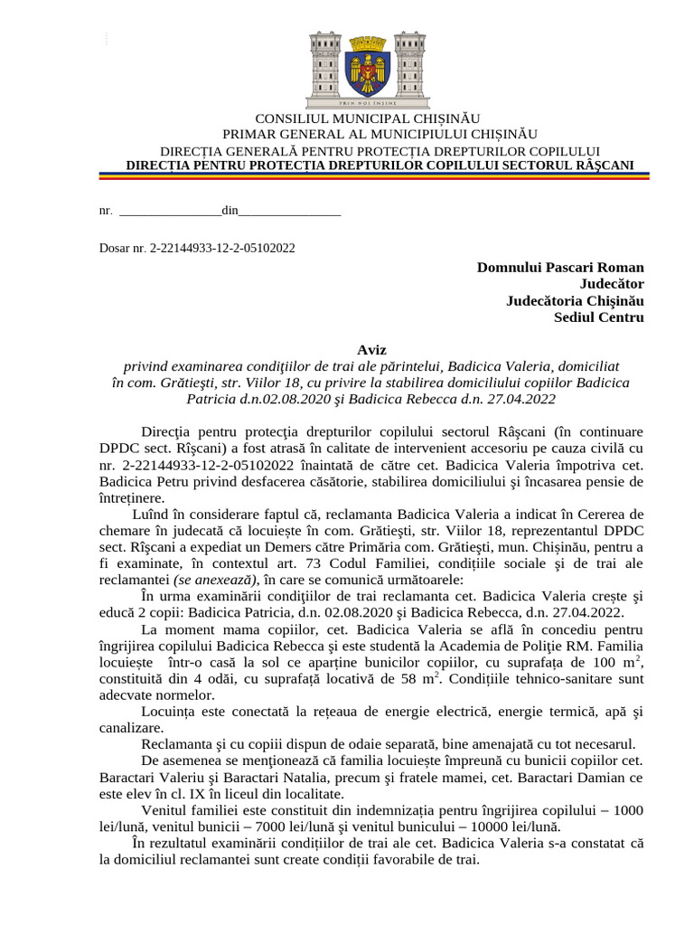 privind examinarea condiţiilor de trai ale părintelui, Badicica Valeria, domiciliat