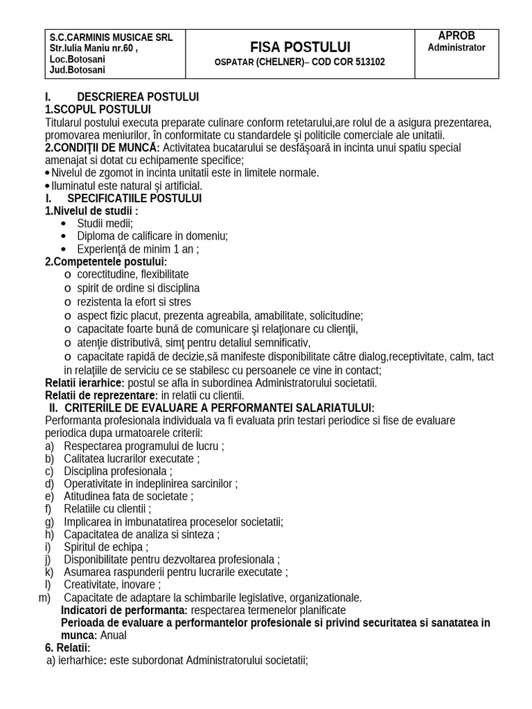 Prezenta fisa a postului face parte integrantă din C.I.M. semnat intre salariat şi conducere.