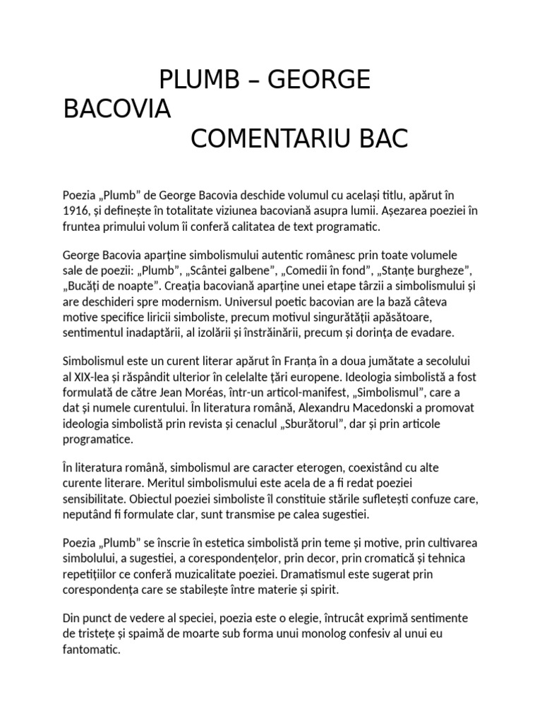 Poezia „Plumb” se înscrie în estetica simbolistă prin teme și motive, prin cultivarea