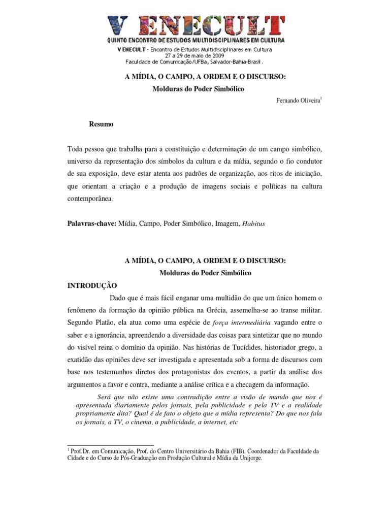 A MDIA, O CAMPO, A ORDEM E O DISCURSO: Molduras do Poder Simblico INTRODUO Dado que mais fcil enganar uma multido do que um nico homem o fenmeno da formao da opinio pblica na Grcia, assemelha-se ao transe militar. Segundo Plato, ela atua como uma espcie de fora intermediria vagando entre o saber e a ignorncia, apreendendo a diversidade das coisas para sintetizar que no mundo do visvel reina o domnio da opinio. Nas histrias de Tucdides, historiador grego, a exatido das opinies deve ser investigada e apresentada sob a forma de discursos com base nos testemunhos diretos dos protagonistas dos eventos, a partir da anlise dos argumentos a favor e contra, mediante a anlise crtica e a checagem da informao. Ser que no existe uma contradio entre a viso de mundo que nos apresentada diariamente pelos jornais, pela publicidade e pela TV e a realidade propriamente dita? Qual de fato o objeto que a mdia representa? Do que nos fala os jornais, a TV, o cinema, a publicidade, a internet, etc