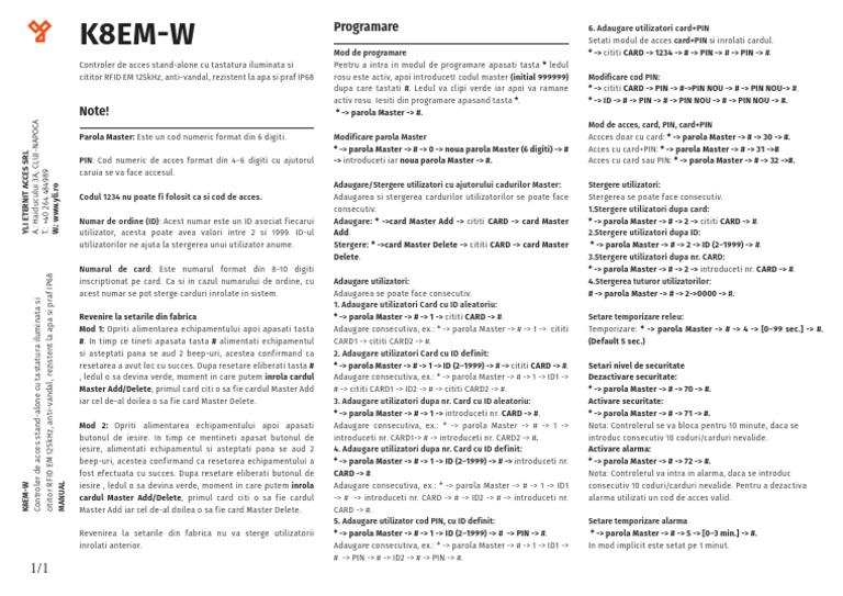 PIN: Cod numeric de acces format din 4~6 digiti cu ajutorul -> introduceti iar noua parola Master -> #. Acces cu card sau PIN: * -> parola Master -> # -> 32 ->#.