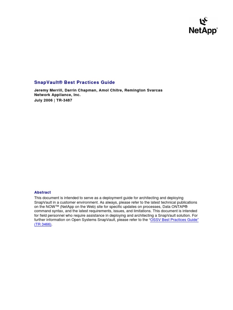 Abstract This document is intended to serve as a deployment guide for architecting and deploying SnapVault in a customer environment. As always, please refer to the latest technical publications on the NOW (NetApp on the Web) site for specific updates on processes, Data ONTAP command syntax, and the latest requirements, issues, and limitations. This document is intended for field personnel who require assistance in deploying and architecting a SnapVault solution. For further information on Open Systems SnapVault, please refer to the OSSV Best Practices Guide (TR 3466).