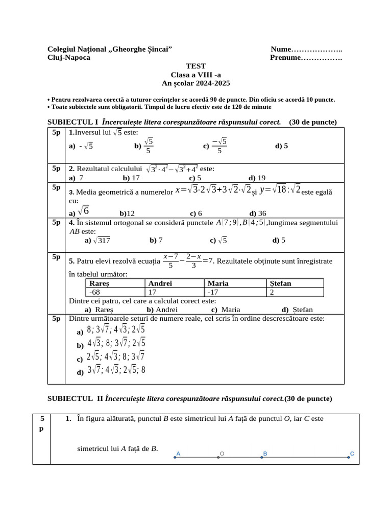 Colegiul Național „Gheorghe Șincai” Nume………………..
