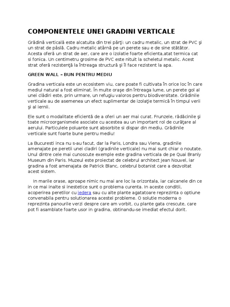 Grdin vertical este alcatuita din trei pri: un cadru metalic, un strat de PVC i un strat de psl. Cadru metalic atrn pe un perete sau e de sine stttor. Acesta ofer un strat de aer, care are o izolatie foarte eficienta,atat termica cat si fonica. Un centimetru grosime de PVC este nituit la scheletul metalic. Acest strat ofer rezisten la ntreaga structur i l face rezistent la apa. GREEN WALL BUN PENTRU MEDIU Gradina verticala este un ecosistem viu, care poate fi cultivata n orice loc n care mediul natural a fost eliminat. n multe orae din ntreaga lume, un perete gol al unei cldiri este, prin urmare, un refugiu valoros pentru biodiversitate. Grdinile verticale au de asemenea un efect suplimentar de izolaie termic n timpul verii i al iernii. Ele sunt o modalitate eficient de a oferi un aer mai curat. Frunzele, rdcinile i toate microorganismele asociate cu acestea au un important rol de curare al aerului. Particulele poluante sunt absorbite si dispar din mediu. Grdinile verticale sunt foarte bune pentru mediu! La Bucuresti inca nu s-au facut, dar la Paris, Londra sau Viena, gradinile amenajate pe peretii unei cladiri (gradinile verticale) nu mai sunt chiar o noutate. Unul dintre cele mai cunoscute exemple este gradina verticala de pe Quai Branly Museum din Paris. Muzeul este proiectat de celebrul architect Jean Nouvel, iar gradina a fost amenajata de Patrick Blanc, celebrul botanist care a dezvoltat acest sistem. In marile orase, aproape nimic nu mai are loc la orizontala, iar calcanele din ce in ce mai inalte si inestetice sunt o problema curenta. In aceste conditii, acoperirea peretilor cu iedera sau cu alte plante agatatoare reprezinta o optiune convenabila pentru solutionarea acestei probleme. O solutie moderna o reprezinta panourile verzi despre care am vorbit, cu plante gata crescute, care pot fi asamblate foarte usor in gradina, obtinandu-se imediat efectul dorit.
