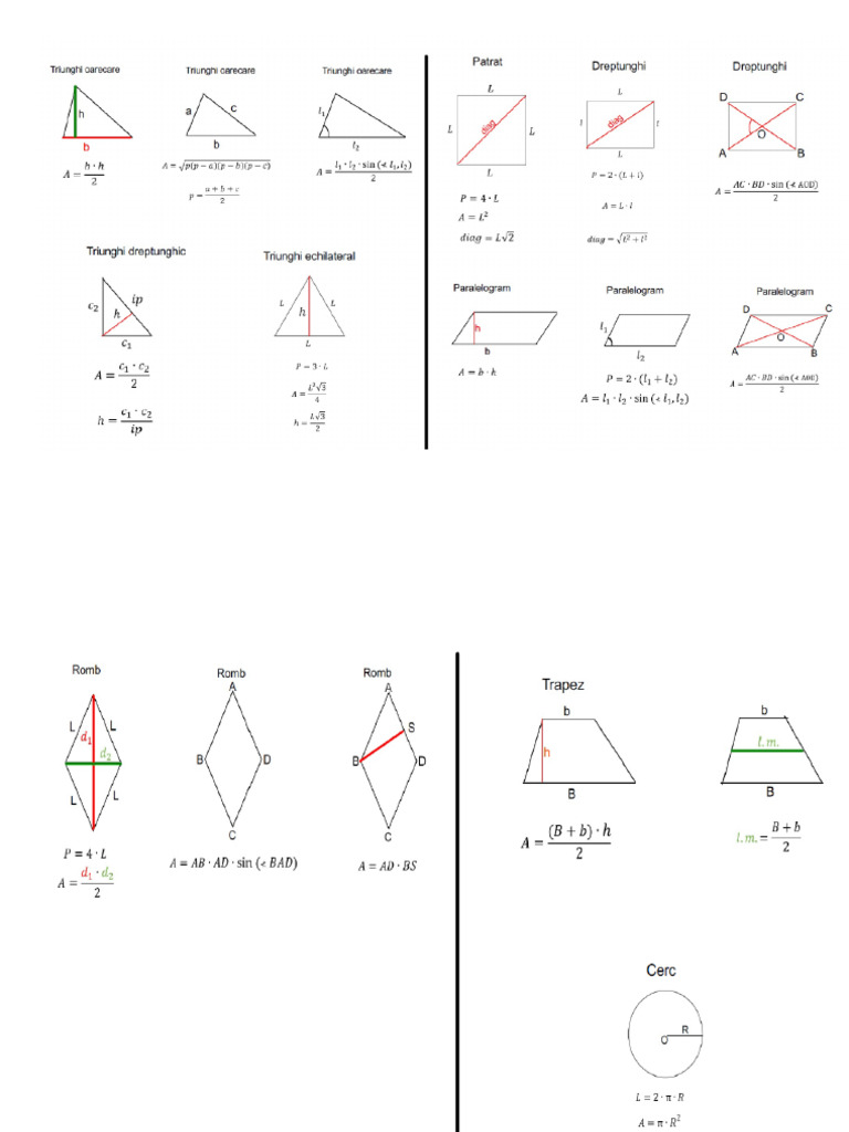 Documentul prezintă concepte esențiale din geometrie, inclusiv teorema înălțimii, teorema lui Pitagora și proprietățile triunghiurilor dreptunghice. De asemenea, sunt incluse formule pentru măsurarea lungimii, ariei și volumului, precum și relații între unghiuri și laturile triunghiurilor. Informațiile sunt organizate într-un format care facilitează înțelegerea principiilor geometrice de bază.