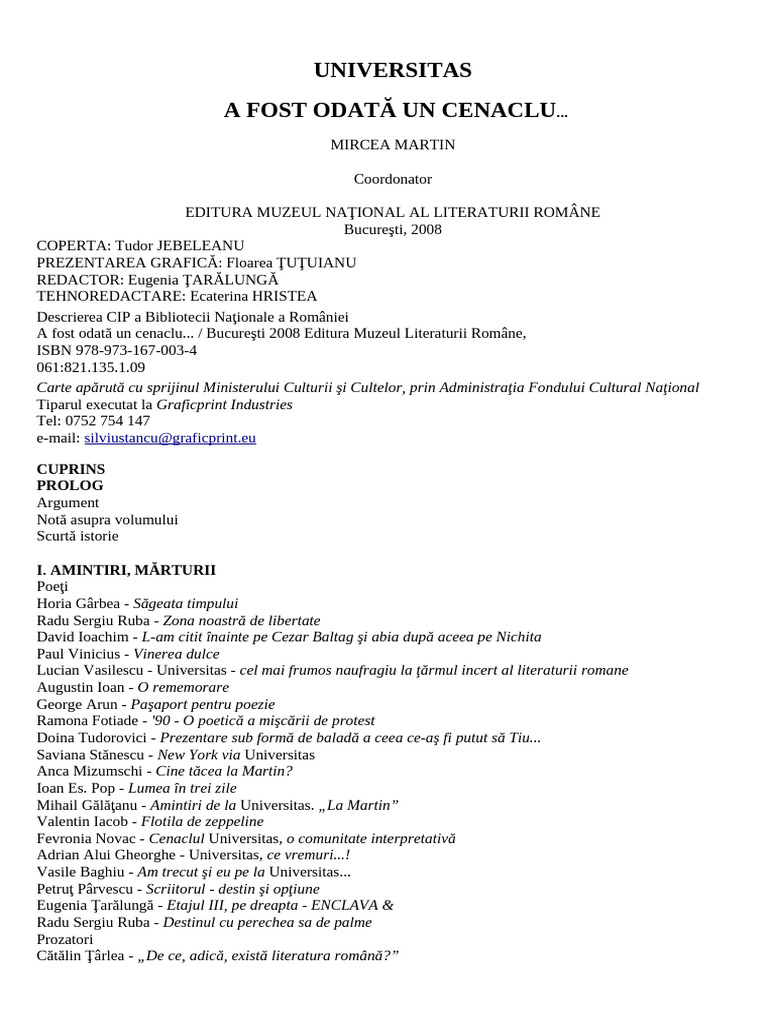 va fi înfiinţat cenaclul Universitas condus de Mircea Martin.” (!)