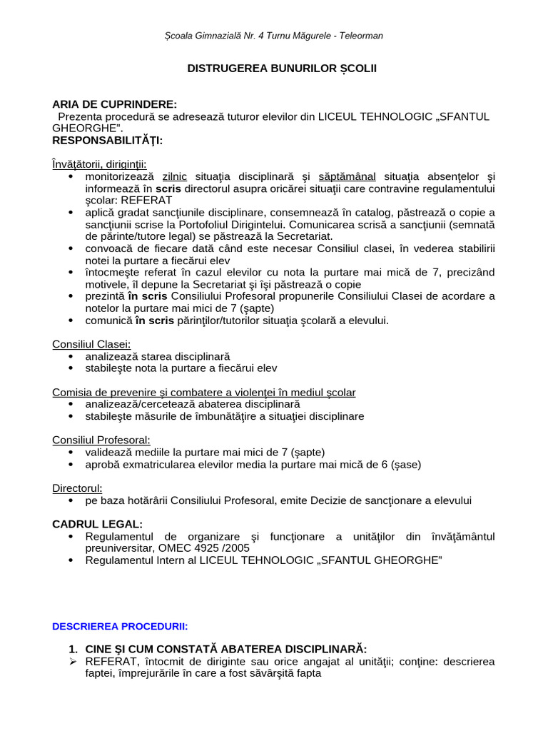 Prezenta procedură se adresează tuturor elevilor din LICEUL TEHNOLOGIC „SFANTUL