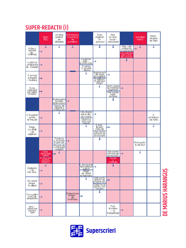 Documentul conține lucrări semnate de Marius Haranguș, intitulate 'SUPER-REDACȚII (I)' și 'SUPER-REDACȚII (II)'. Acestea sunt parte dintr-o serie de superscrieri. Informațiile detaliate despre conținutul specific al acestor lucrări nu sunt incluse.