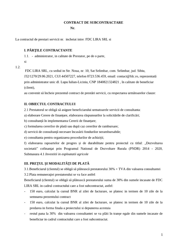 La contractul de prestari servicii nr. incheiat intre: FDC LIRA SRL si