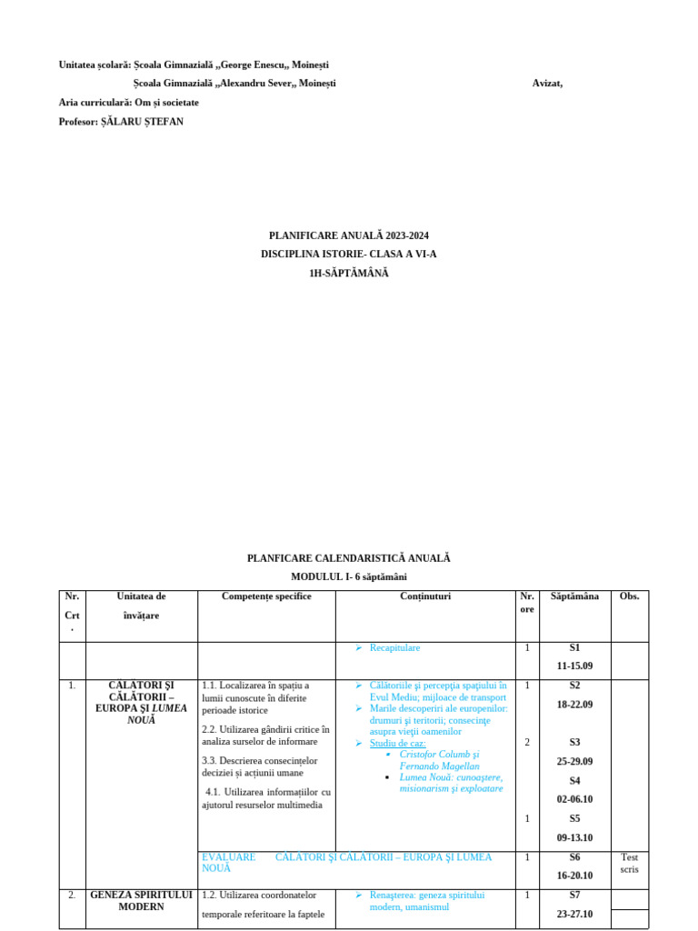 Nr. Unitatea de Competențe specifice Conținuturi Nr. Săptămâna Obs.
