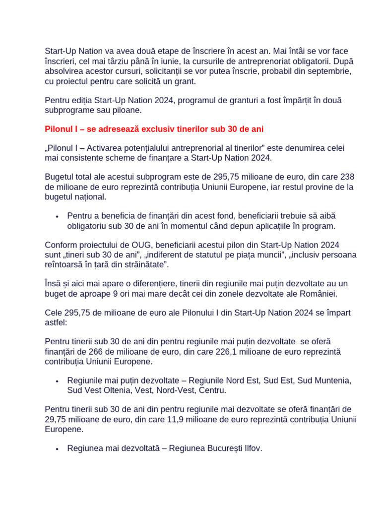 Pilonul I din Start-Up Nation 2024 își propune ca obiective: