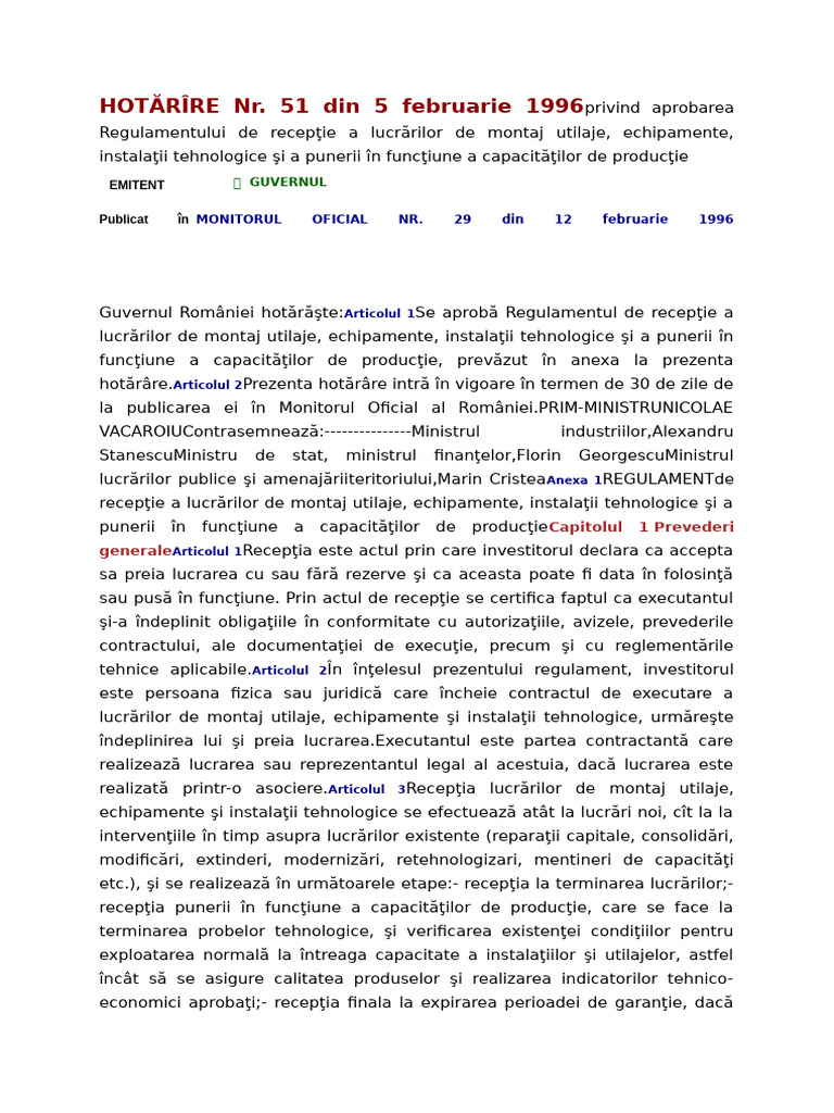 51 din 5 februarie 1996 privind aprobarea
