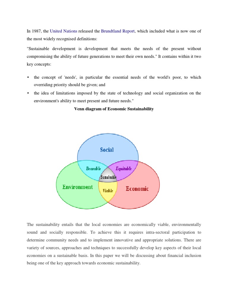 the idea of limitations imposed by the state of technology and social organization on the environment's ability to meet present and future needs." Venn diagram of Economic Sustainability