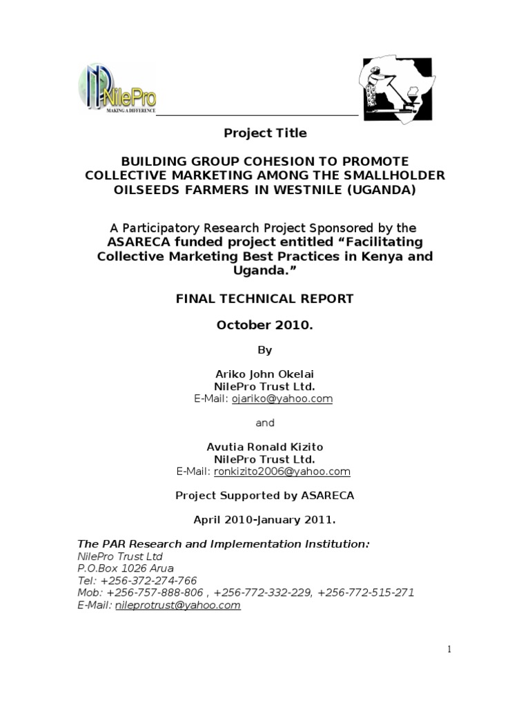 together towards poverty reduction and livelihoods improvement. The premise is that hat these small groups can produce sufficiently to meet market demands through collective marketing. This report will describe the background to the study and then highlight the research problem, the methodology used for the study, we will present the research findings and discuss the study findings as well as make some recommendations for best practices in collective marketing. Background and Context of the Study In 2009, NilePro Trust and several other Ugandan and Kenyan Organizations working to facilitate collective marketing commenced a forum convened by AT Uganda called The Collective Marketing Learning Alliance. In the alliance low group cohesion was identified as one of the factors hindering small farmers groups from effectively engaging in collective marketing in both Uganda and Kenya. The learning alliance NilePro Trust carried out the engaged in Building group cohesion to promote collective marketing among the smallholder oilseeds farmers in West Nile. Through a collaborative study with AT Uganda identified and clustered the key constraints into three broad themes that included (a) Farmer organization (b) Access to Capital and Stimulating Increased farmer investment in enterprise; and, (c) Increasing farmer access to remunerative markets under the sub-themes of (i) Quality control and certification, (ii) Production Planning, and (iii) Market Linkages and Market Information. Building group cohesion is at the centre of farmer group organization and was the focus of this study. Collective marketing is general consider a new approach to increasing the marketing clout of smallholder farmers by drawing on the advantages that accrue from the use of social capital. This can best be harnessed where there are strong and well coherent farmer organizations. However organizations implementing collective marketing programs have been faced with a significant challenge of weak farmer producer and apex organizations that are unable to forge collective action and work as a unit a situation that undermines the sustainability of any such programs beyond donor interventions. The collective marketing models recognize smallholder farmers as high costs producer and are designed to help farmers reduce both production and marketing transaction costs so as to increase farm profitability by lowering unit costs. Statement of the Critical constraint The use of Social capital to through collective marketing is one way smallholder farmers can access fair and effective markets. Lowering transaction costs among smallholder farmers is key to increased profitability and marketability of their products. However collective marketing requires that there must be strong apex marketing structures to support the processes of collective marketing. Building these apex 13