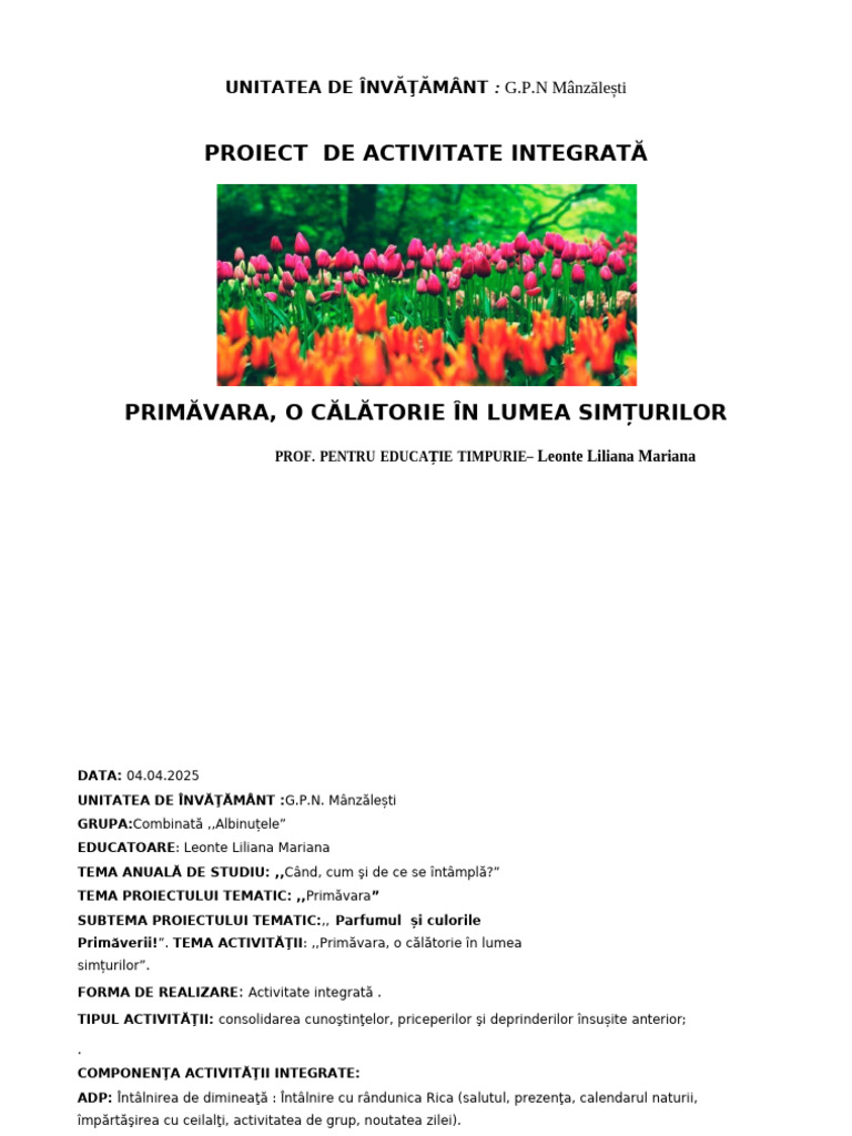 Primăverii!”. TEMA ACTIVITĂŢII: ,,Primăvara, o călătorie în lumea