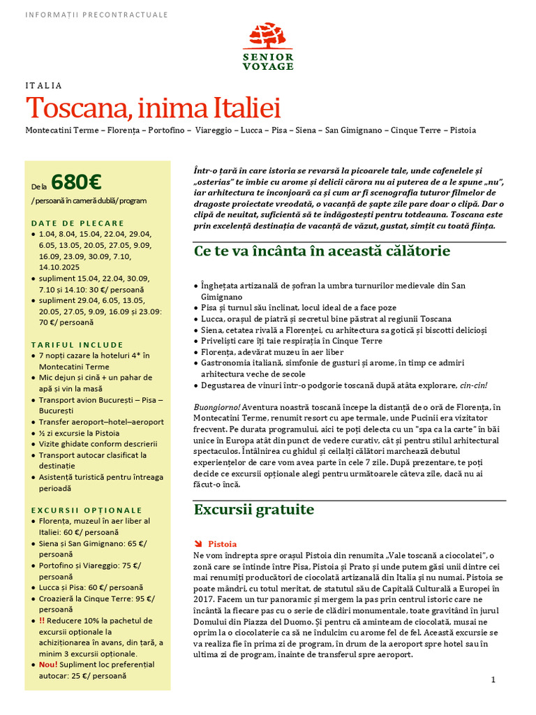 Montecatini Terme – Florența – Portofino – Viareggio – Lucca – Pisa – Siena – San Gimignano – Cinque Terre – Pistoia