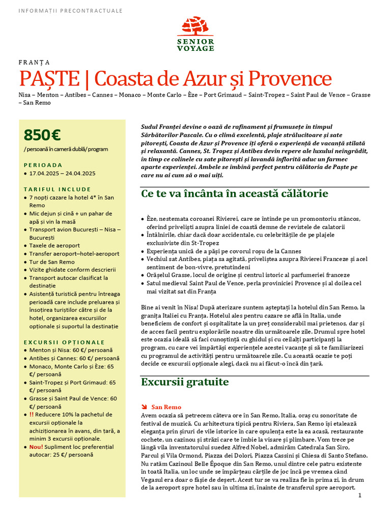 • Menton și Nisa: 60 €/ persoană program, cu care vei împărtăși experiențele acestei vacanțe și să te familiarizezi
