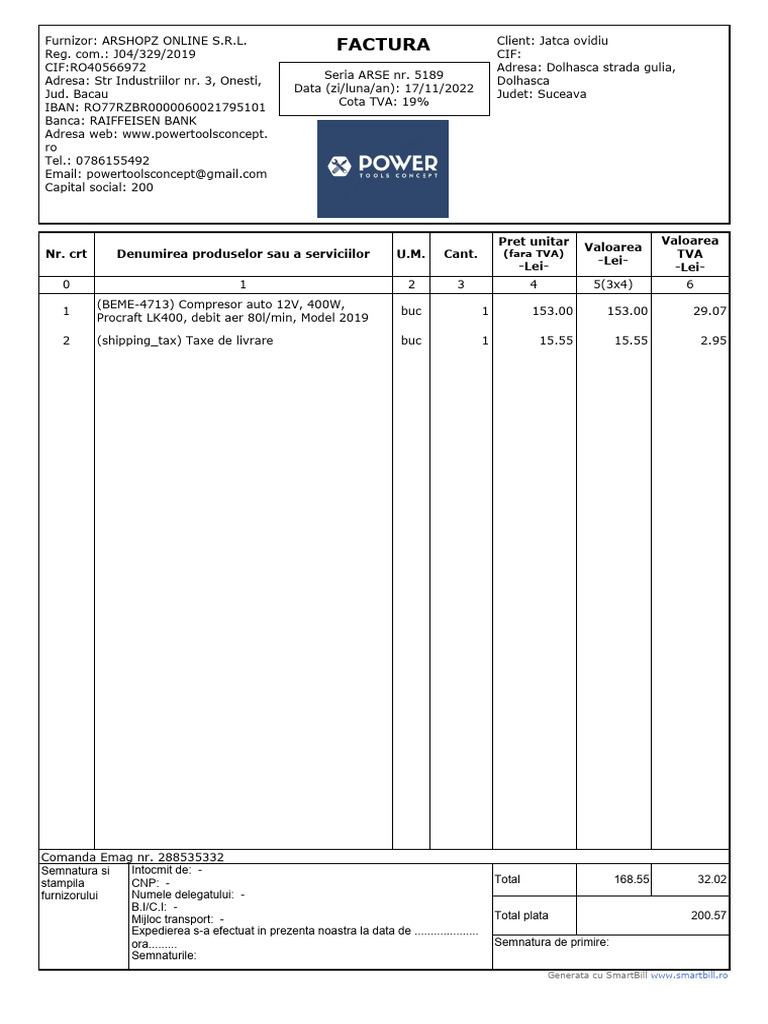 2 (shipping_tax) Taxe de livrare buc 1 15.55 15.55 2.95