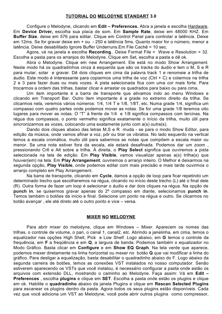 . Em Device Driver, escolha sua placa de som. Em Sample Rate, deixe em 48000 KHZ. Em Buffer Size, deixe em 576 para editar. Clique em Control Panel para controlar a latncia. Deixe em 12ms. Se for gravar deixe em + ou - 250 e latncia 5ms. Quanto maior for o nmero, menor a latncia. Deixe desabilitado Ignore Buffer Underruns.Em File Cach = 10 sec. Agora, v na janela e escolha Recording.. Deixe Format File = Wave e Resolution = 32. Escolha a pasta para os arranjos do Melodyne. Clique em Set, escolha a pasta e d ok. Abra o Melodyne. Clique em new Arrangement. Ele est no modo Show Arrangement. Neste modo h os quadradinhos cinza esquerda que so os tracks do udio e tem o M, S e R para mutar, solar e gravar. D dois cliques em cima da palavra track 1 e renomeie a trilha de udio. Este modo interessante para copiarmos uma trilha de voz (Ctrl + C) e colarmos na trilha 2 e 3 para fazer duas ou mais vozes. A pista selecionada fica com uma cor mais forte. Para trocarmos a ordem das trilhas, bastar clicar e arrastar os quadrados para baixo ou para cima, Um item importante a barra de transporte que ativamos indo ao menu Windows e clicando em Transport Bar. Outro item importante a grade no extremo direito da trilha. Se clicarmos nela, veremos vrios nmeros: 1/4, 1/4 T e 1/8, 1/8T, etc. Numa grade 1/4, significa um compasso com quatro partes onde podemos mover as notas. Se for uma grade 1/8 teremos oito lugares para mover as notas. O T frente de 1/4 e 1/8 significa compassos com tercinas. Na rgua dos compassos, o ponto vermelho significa exatamente o incio da trilha, muito til para sincronizarmos as vozes, colocando uma exatamente junto com a(s) outra(s). Dando dois cliques abaixo das letras M,S e R muda - se para o modo Show Editor, para edio da msica, onde vamos afinar a voz, pr ou tirar os vibratos. No lado esquerdo na vertical temos a escala cromtica, muito til para sabermos as notas que compem a escala maior ou menor. Se uma nota estiver fora da escala, ela estar desafinada. Podemos dar um zoom , pressionando Crtl e Alt sobre a trilha. direita, o Play Select significa que ouviremos a pista selecionada na tela de edio. Em Play Visible, vamos visualizar apenas a(s) trilha(s) que houver(em) na tela. Em Play Arrangement, ouviremos o arranjo inteiro. O Melhor deixarmos na segunda opo, Play Visible, onde podemos editar com mais preciso e mais tarde ouvirmos o arranjo completo em Play Arrangement. Na barra de transporte, clicando em Cycle, damos a opo de loop para ficar repetindo um determinado trecho que escolheremos na rgua, clicando no incio deste trecho (L) at o final dele (R). Outra forma de fazer um loop selecionar o udio e dar dois cliques na rgua. Na opo de punch in, se quisermos gravar apenas do 2 compasso em diante, selecionamos punch in. Temos tambm o botes de incio e final. Selecione um ponto na rgua e outro. Se clicarmos no boto avanar , ele at direto at o outro ponto e vice versa. MIXER NO MELODYNE Para abrir mixer do melodyne, clique em Windows Mixer. Aparecem os nomes das trilhas, o controle de volume, o pan, o canal 1, canal2, etc. Abrindo a janelinha, em cima, temos o equalizador nas opes High Shell, Pick e Low Shelf. Logo abaixo, em G temos o controle da frequncia, em F a freqncia e em Q, a largura de banda. Podemos tambm o equalizador no Modo Grfico. Basta clicar em Configure e em Show EQ Graph. Na tela verde que aparece, podemos mexer diretamente na linha horizontal ou mexer no boto Q que vai modificar a linha do grfico. Para desligar a equalizao, basta desabilitar o quadradinho abaixo do F. Logo abaixo da segunda carreira de botes, temos as conexes VST instalados no nosso computador. Seno estiverem aparecendo os VSTs que voc instalou, necessrio configurar a pasta onde esto os arquivos com extenso DLL, mostrando o caminho ao Melodyne. Faa assim: V em Edit Preferences , escolha plugins e clique em SET. Escolha a pasta onde esto os plugins e clique em ok. Habilite o quadradinho abaixo da janela Plugins e clique em Rescan Selected Plugins para escanear os plugins dentro da pasta. Agora todos os seus plugins esto disponveis. Cada vez que voc adiciona um VST ao Melodyne, voc pode abrir outros plugins como compressor,