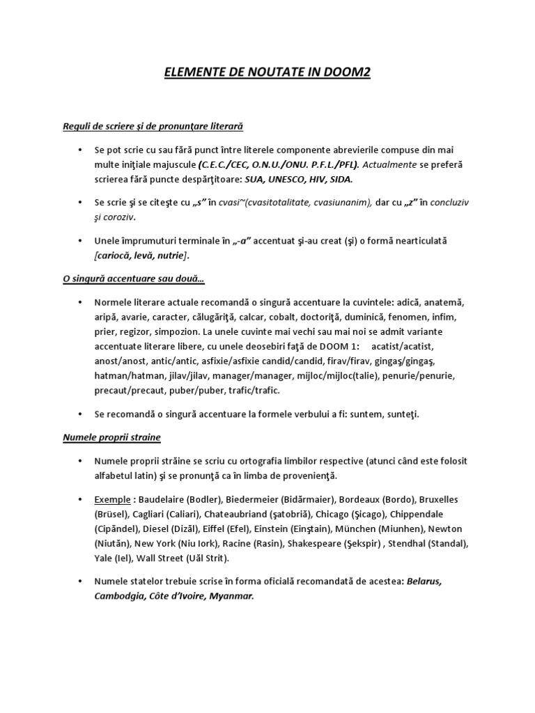 Reguli de scriere i de pronunare literar Se pot scrie cu sau fr punct ntre literele componente abrevierile compuse din mai multe iniiale majuscule (C.E.C./CEC, O.N.U./ONU. P.F.L./PFL). Actualmente se prefer scrierea fr puncte despritoare: SUA, UNESCO, HIV, SIDA. Se scrie i se citete cu s n cvasi~(cvasitotalitate, cvasiunanim), dar cu z n concluziv i coroziv. Unele mprumuturi terminale n -a accentuat i-au creat (i) o form nearticulat [carioc, lev, nutrie].