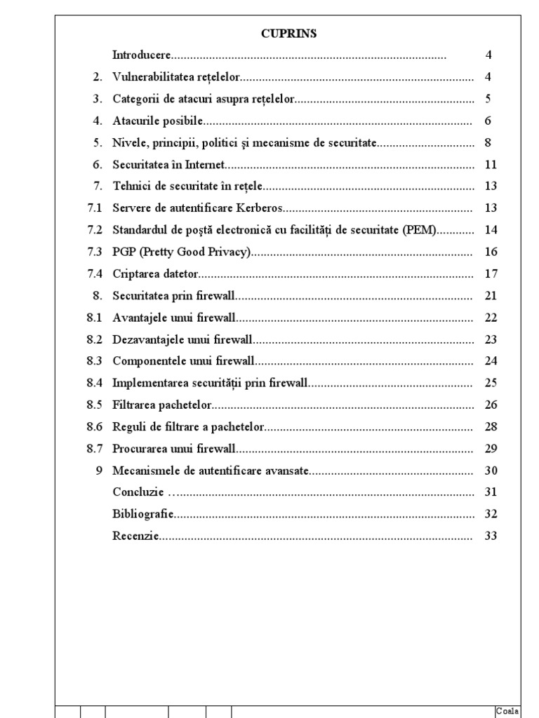 8 6. Securitatea n Internet............................................................................... 11 7. Tehnici de securitate n reele................................................................... 13 7.1 Servere de autentificare Kerberos............................................................ 13 7.2 Standardul de pot electronic cu faciliti de securitate (PEM)............ 14 7.3 PGP (Pretty Good Privacy)...................................................................... 16 7.4 Criptarea datetor....................................................................................... 17 8. Securitatea prin firewall........................................................................... 21 8.1 Avantajele unui firewall........................................................................... 22 8.2 Dezavantajele unui firewall...................................................................... 23 8.3 Componentele unui firewall..................................................................... 24 8.4 Implementarea securitii prin firewall.................................................... 25 8.5 Filtrarea pachetelor................................................................................... 26 8.6 Reguli de filtrare a pachetelor.................................................................. 28 8.7 Procurarea unui firewall........................................................................... 29 9 Mecanismele de autentificare avansate.................................................... 30 Concluzie ............................................................................................. 31 Bibliografie............................................................................................... 32 Recenzie................................................................................................... 33