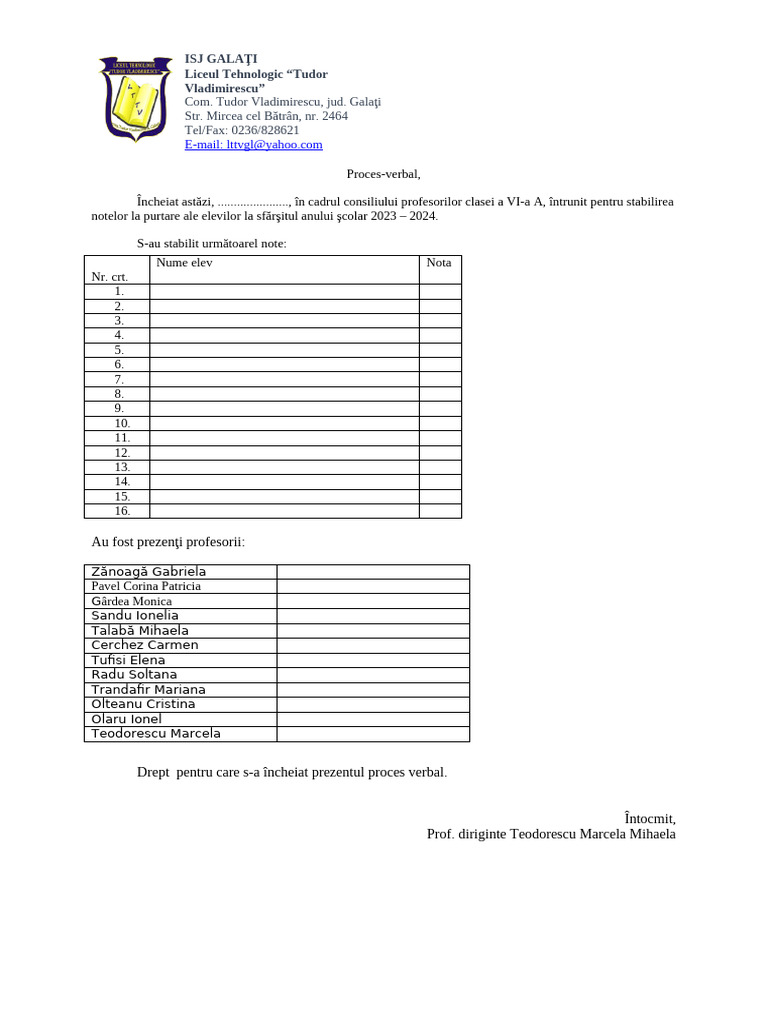 Încheiat astăzi, ......................, în cadrul consiliului profesorilor clasei a VI-a A, întrunit pentru stabilirea