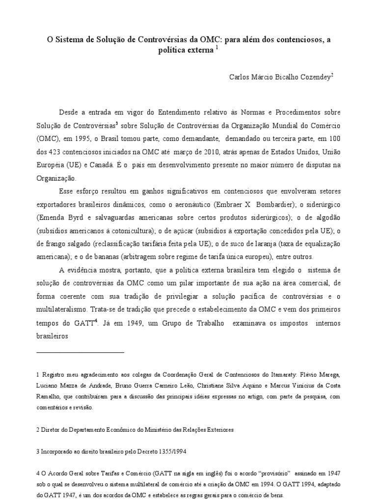 1 Registro meu agradecimento aos colegas da Coordenao Geral de Contenciosos do Itamaraty: Flvio Marega, Luciano Mazza de Andrade, Bruno Guerra Carneiro Leo, Christiane Silva Aquino e Marcus Vincius da Costa Ramalho, que contriburam para a discusso das principais idias expressas no artigo, com parte da pesquisa, com comentrios e reviso. 2 Diretor do Departamento Econmico do Ministrio das Relaes Exteriores 3 Incorporado ao direito brasileiro pelo Decreto 1355/1994 4 O Acordo Geral sobre Tarifas e Comrcio (GATT na sigla em ingls) foi o acordo provisrio assinado em 1947 sob o qual se desenvolveu o sistema multilateral de comrcio at a criao da OMC em 1994. O GATT 1994, adaptado do GATT 1947, um dos acordos da OMC e estabelece as regras gerais para o comrcio de bens.