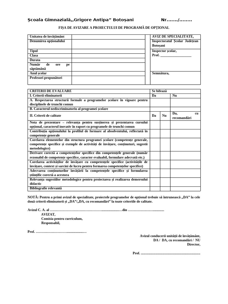 NOTĂ: Pentru a primi avizul de specialitate, proiectele programelor de opțional trebuie să întrunească ,,DA” la cele