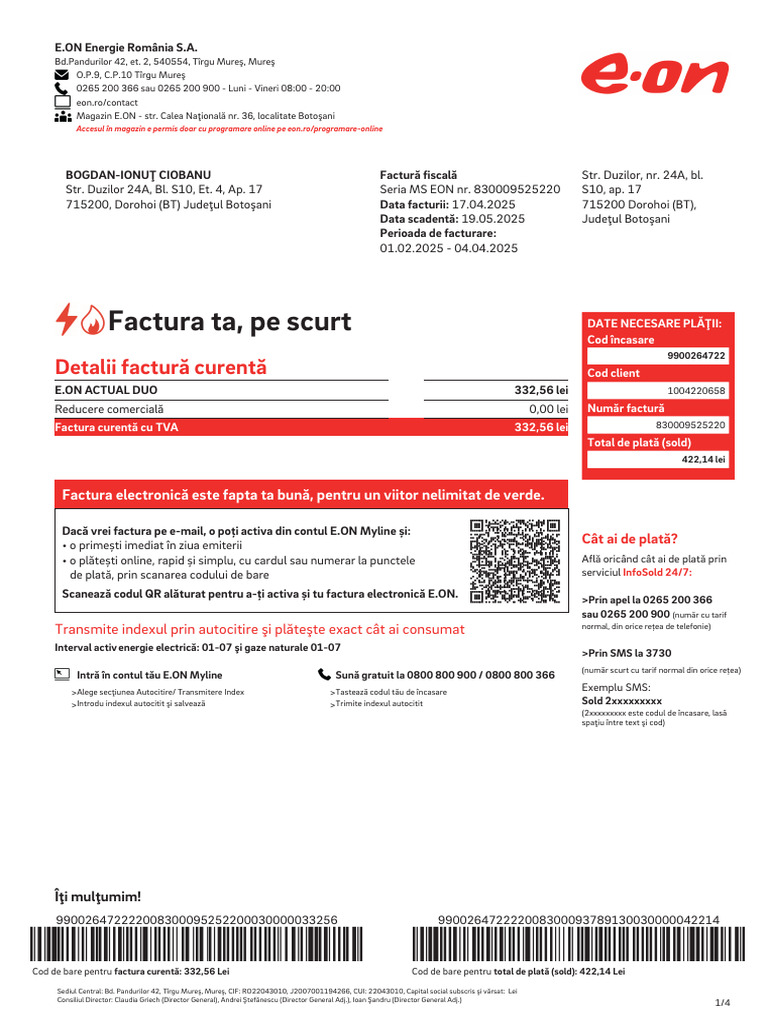 Cod de bare pentru factura curentă: 332,56 Lei Cod de bare pentru total de plată (sold): 422,14 Lei