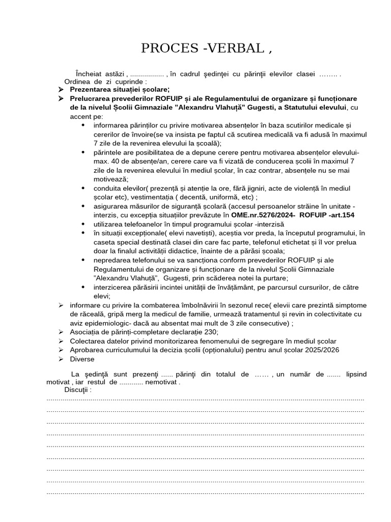 La şedinţă sunt prezenţi ...... părinţi din totalul de …… , un număr de ....... lipsind