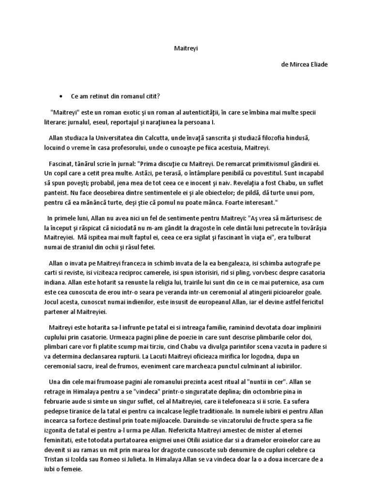 "Maitreyi" este un roman exotic i un roman al autenticitii, n care se mbina mai multe specii literare: jurnalul, eseul, reportajul i naraiunea la persoana I. Allan studiaza la Universitatea din Calcutta, unde nva sanscrita i studiaz filozofia hindus, locuind o vreme n casa profesorului, unde o cunoate pe fiica acestuia, Maitreyi. Fascinat, tnrul scrie n jurnal: "Prima discuie cu Maitreyi. De remarcat primitivismul gndirii ei. Un copil care a cetit prea multe. Astzi, pe teras, o ntmplare penibil cu povestitul. Sunt incapabil s spun poveti; probabil, jena mea de tot ceea ce e inocent i naiv. Revelaia a fost Chabu, un suflet panteist. Nu face deosebirea dintre sentimentele ei i ale obiectelor; de pild, d turte unui pom, pentru c ea mnnc turte, dei tie c pomul nu poate mnca. Foarte interesant." In primele luni, Allan nu avea nici un fel de sentimente pentru Maitreyi: "A vrea s mrturisesc de la nceput i rspicat c niciodat nu m-am gndit la dragoste n cele dinti luni petrecute n tovria Maitreyiei. M ispitea mai mult faptul ei, ceea ce era sigilat i fascinant n viaa ei", era tulburat numai de straniul din ochii i rsul fetei. Allan o invata pe Maitreyi franceza in schimb invata de la ea bengaleaza, isi schimba autografe pe carti si reviste, isi viziteaza reciproc camerele, isi spun istorisiri, rid si pling, vorvbesc despre casatoria indiana. Allan este hotarit sa renunte la religia lui, trairile lui sunt din ce in ce mai puternice, asa cum este cea cunoscuta de erou intr-o seara pe veranda intr-un ceremonial al atingerii picioarelor goale. Jocul acesta, cunoscut numai indienilor, este insusit de europeanul Allan, iar el devine astfel fericitul partener al Maitreyiei. Maitreyi este hotarita sa-l infrunte pe tatal ei si intreaga familie, raminind devotata doar implinirii cuplului prin casatorie. Urmeaza pagini pline de poezie in care sunt descrise plimbarile celor doi, plimbari care vor fi platite scump mai tirziu, cind Chabu va divulga parintilor scena vazuta in padure si va determina declansarea rupturii. La Lacuti Maitreyi oficieaza mirifica lor logodna, dupa un ceremonial sacru, ireal de frumos, eveniment care marcheaza punctul culminant al iubiriilor. Una din cele mai frumoase pagini ale romanului prezinta acest ritual al "nuntii in cer". Allan se retrage in Himalaya pentru a se "vindeca" printr-o singuratate deplina; din octombrie pina in februarie aude si simte un singur suflet, cel al Maitreyiei, care ii telefoneaza si ii scrie. Ea sufera pedepse tiranice de la tatal ei pentru ca incalcase legile traditionale. In numele iubirii ei pentru Allan incearca sa forteze destinul prin toate mijloacele. Daruindu-se vinzatorului de fructe spera sa fie izgonita de tatal ei pentru a-l urma pe Allan. Nefericita Maitreyi amestec de mister al eternei feminitati, este totodata purtatoarea enigmei unei Otilii asiatice dar si a dramelor eroinelor care au devenit si au ramas un mit prin marea lor dragoste cunoscute sub denumire de cupluri celebre ca Tristan si Izolda sau Romeo si Julieta. In Himalaya Allan se va vindeca doar la o a doua incercare de a iubi o femeie.