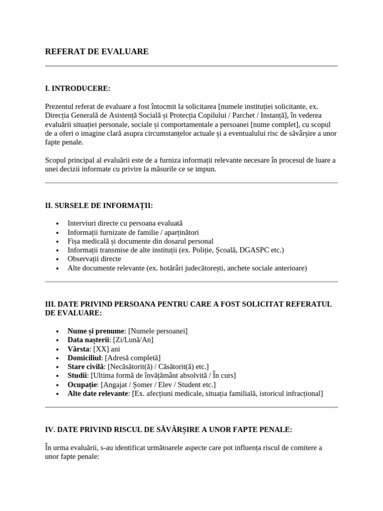 Prezentul referat de evaluare a fost întocmit la solicitarea [numele instituției solicitante, ex.