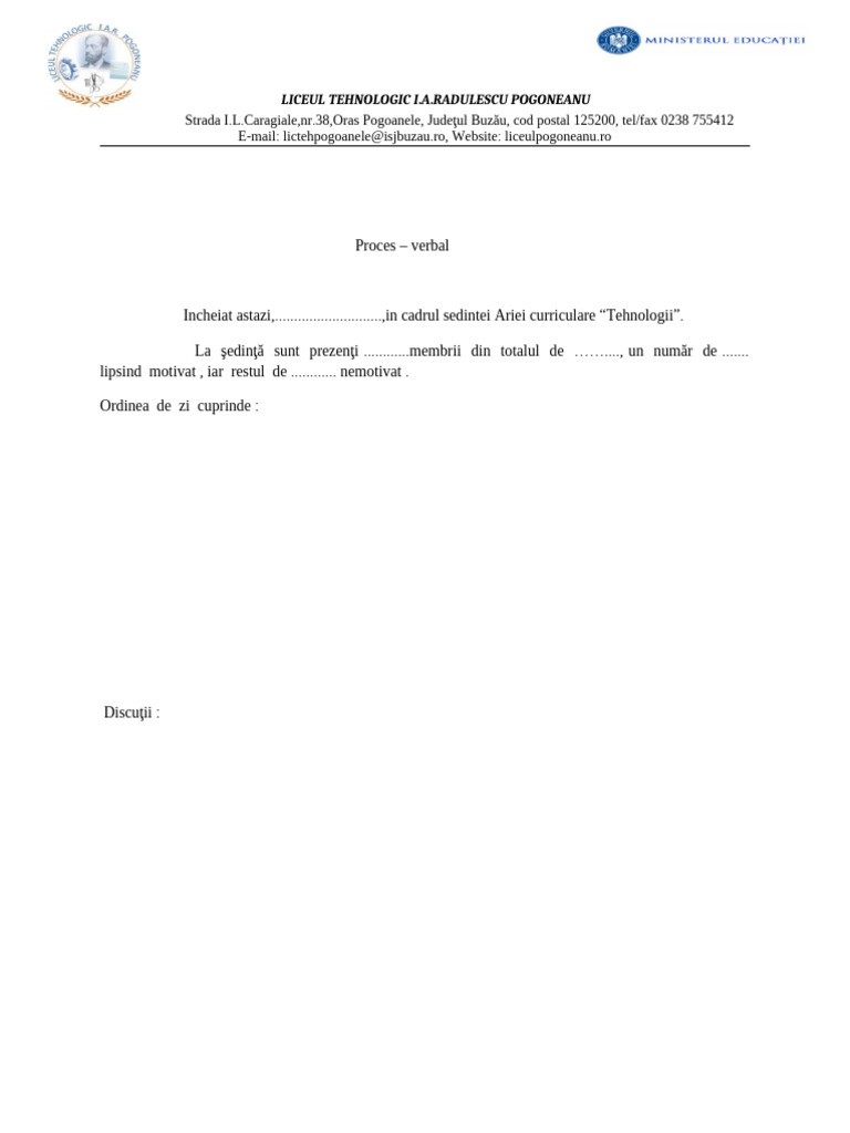Incheiat astazi,............................,in cadrul sedintei Ariei curriculare “Tehnologii”.