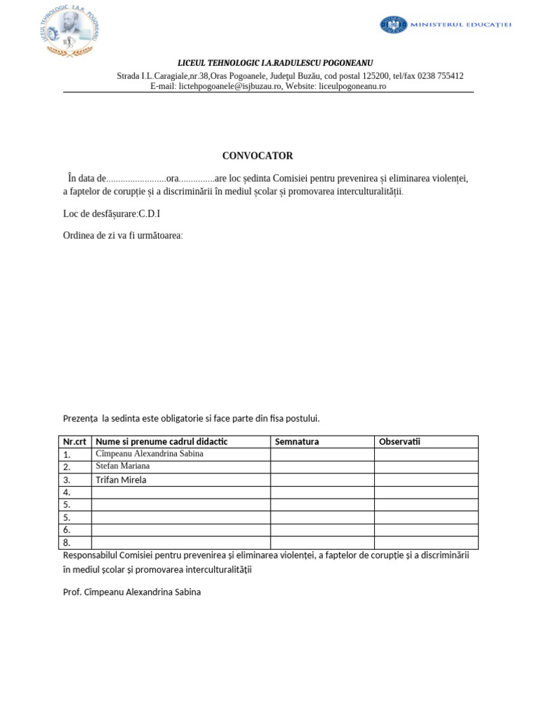 În data de.........................ora...............are loc ședinta Comisiei pentru prevenirea și eliminarea violenței,