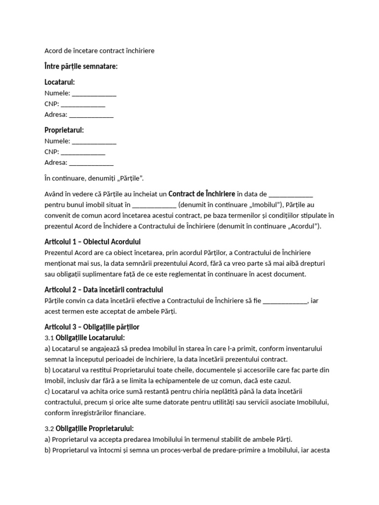 Prezentul Acord are ca obiect încetarea, prin acordul Părților, a Contractului de Închiriere