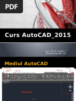 pentru axele OX, OY i OZ, separate prin virgul. n situaia n care punctul se gsete n planul XOY atunci se introduc numai valorile pentru axa OX i OY, iar n cazul unei reprezentri tridimensionale se introduc valori pentru toate cele trei axe OX, OY respectiv OZ. Valorile introduse pot fi pozitive i/sau negative. Pentru introducerea unei valori pozitive nu este necesar introducerea semnului +. n schimb pentru valorile negative este necesar introducerea semnului - (ex. -1,2 sau 2,-5,9). Coordonatele polare absolute determin o poziie raportat de asemenea la originea sistemului bidimensional (n poziia iniial acesta se afl n colul din stnga jos), dar specificarea acesteia se face printr-o distan i un unghi. Valorile distanei i unghiului sunt separate de o parantez unghiular stnga < fr spaii: distan<unghi (de exemplu, 25<135) Unghiurile pozitive sunt msurate n sens invers acelor de ceasornic, pornind de la direcia corespunztoare valorii de 0 grade, care este, n mod prestabilit, direcia pozitiv a axei OX. 2.2.2. Utilizarea coordonatelor relative De obicei, n cadrul unui desen, dup fixarea punctului de nceput al unei linii, se poate stabili poziia fa de acesta a punctului urmtor, fie sub forma distanelor msurate pe axele OX i OY, fie sub forma distanei directe i a unghiului. Coordonatele relative nu respect poziia fa de punctul de origine ci fa de ultimul punct desenat. Aceast metod este mult mai direct i poate fi utilizat att n cazul coordonatelor rectangulare, ct i al coordonatelor polare. Coordonatele relative pot fi difereniate de cele absolute prin simbolul @ care precede valorile. De exemplu, @2.5,2 reprezint coordonate rectangulare relative i @2<30 coordonate polare relative. 2.2.3. Introducerea direct a distanelor AutoCAD-ul permite specificarea coordonatelor relative i prin introducerea direct a distanelor. Pentru utilizarea acestei metode este necesar activarea modului ORTHO (direcii ortogonale). Se specific un punct prin mutarea mouse-ului pentru a specifica direcia i se introduce distana la care va fi desenat urmtorul punct. 2.2.4. Afiarea coordonatelor Fereastra de afiare a coordonatelor este plasat la captul din stnga al barei de stare (v. fig.2)
