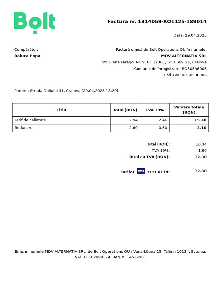 Cumpărător: Factură emisă de Bolt Operations OÜ în numele: